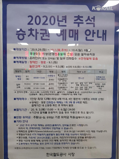 시간이 참 빨리도 갑니다. 새로운 회사에서 새로 직장생활을 하는 것도 그렇고, 코로나19 때문에 별로 다른 곳에 신경도 쓰지 않고 있는데, 오늘 출근길에 지하철 역에서 2020년 추석 승차권 예매 안내 내용이 있어 확인해 보았습니다. 추석 때 고향에 방문 계획인 분들은 며칠 남지 않았기 때문에 일정 잘 확인해서 준비하셔야겠습니다.